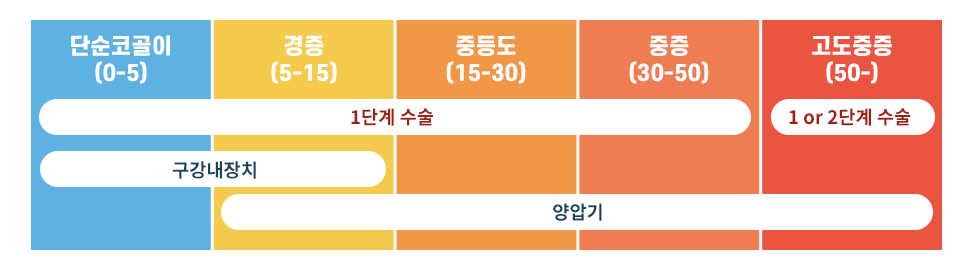 코골이·수면장애는 단지 수면 중 호흡을 하지 않아 문제되는 것이 아닙니다. 단기적으로 수면 시 호흡의 정지가 뇌의 반복적인 각성을 유발하여 수면의 질을 떨어뜨리고, 장기적으로 지속 시 산소 공급의 저하가 다양한 합병증을 유발하므로 증상이 의심된다면 정확한 진단 후 단계에 맞는 치료를 시행하셔야 합니다.
